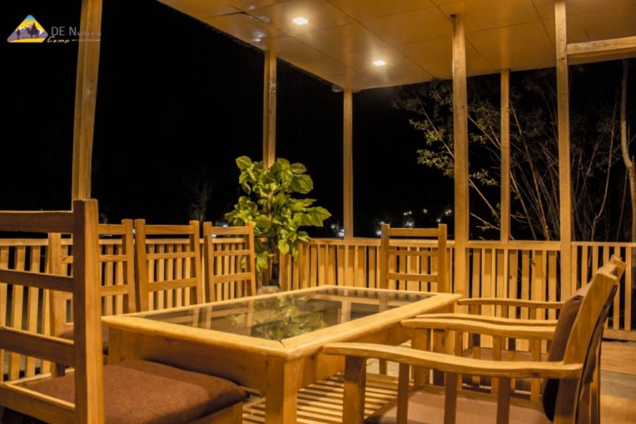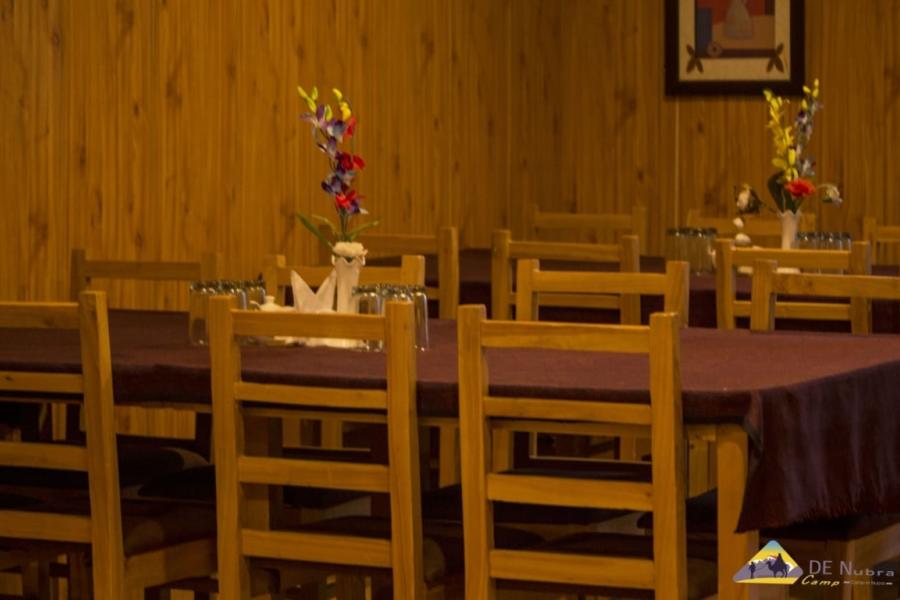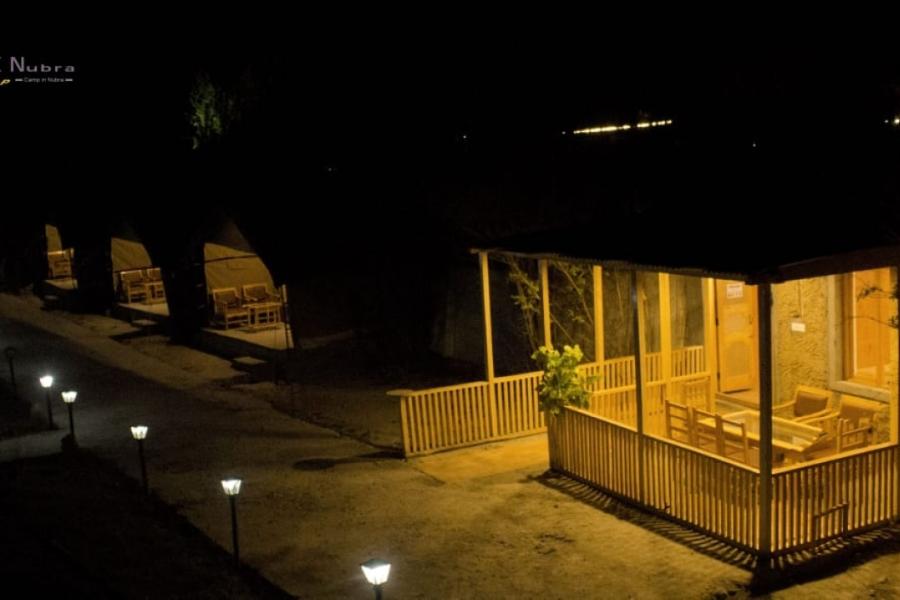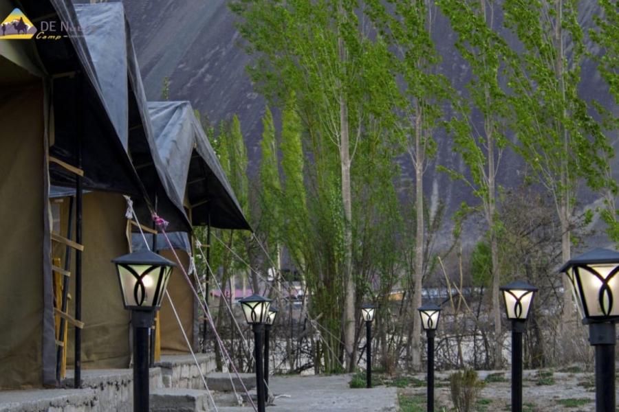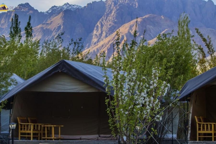 The DE Nubra Camp is located in Nubra near Habib Guest House in Hunder, Nubra Valley Leh Ladakh just outside Disket. (Average altitude 10,000 feet above sea level). Hunder (Nubra Valley) is 127 kms from Leh on the bank of Shyok and Siachen River in Camps in Nubra Valley. The Camps has got 9 Deluxe Tent accomodation with attached bath (Running hot and cold shower). The kitchen has its own organic vegetable garden and serves Indian, Chinese, Continental, Italian and Ladakhi cuisines. It provides stunning views of the famous silver sand dunes and Disket Chamba with spectacular sunrise each morning. Cultural shows are held every evening in Hunder close to the DE Nubra Camp.