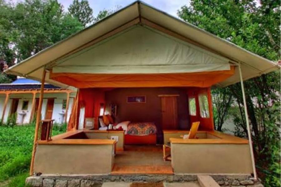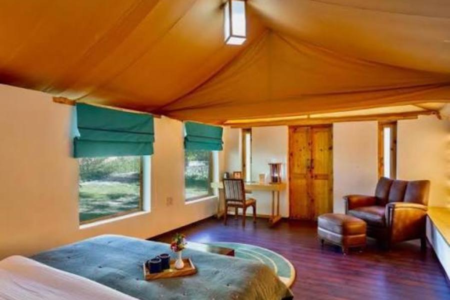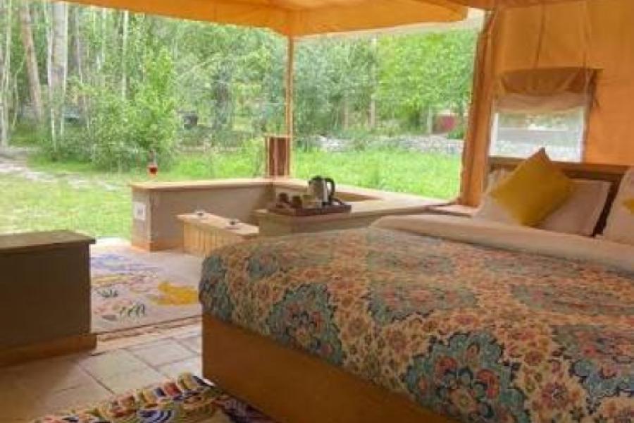 Rated as the top specialty lodge of Nubra for consecutive 10 years on trip advisor, the Organic Retreat comprises of 20 rooms built from mixture of mud and fabrics- spread over sprawling 25 acres of organic farm.Each room is spacious and furnished with king sized beds, duvet bedding, down fill pillows, safes, steam-based room heating, spacious rest rooms. All rooms are enhanced with private balcony. Snow fed stream facing the balcony offers an obstructed view of gigantic mountain range.