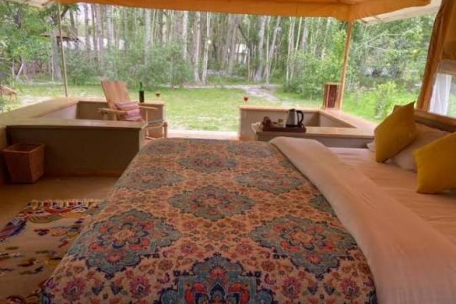Beautifully designed accommodation for two, offering a luxurious, peaceful and comforting experience. The rooms are aesthetically designed  with warm earthen tone fabrics and hand mixed mud plaster giving you an experience of camping  & a luxury stay both at the same time . King size beds ,Soft  cotton sheets,the finest mattresses , down fill pillows will add more  to your comfort . Bathrooms attached with the accommodations are equipped with all modern facilities &  amenities . Each accommodation has a small porch with relaxing chair for lounging.