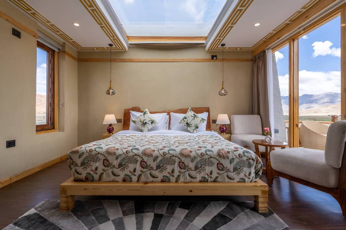The Premium Room with SunRoof for Stargazing at The Sky Abode Hanle offers guests a luxurious stay with breathtaking views of the Ladakh night sky, allowing them to witness millions of stars, the Milky Way, and shooting stars directly from their bed through a specially designed sunroof, creating an unforgettable celestial experience. Unforgettable gazing night in Ladakh at The Sky Abode Hanle, dark skies, stars, Milky Way, telescopes, serene luxury stay experience